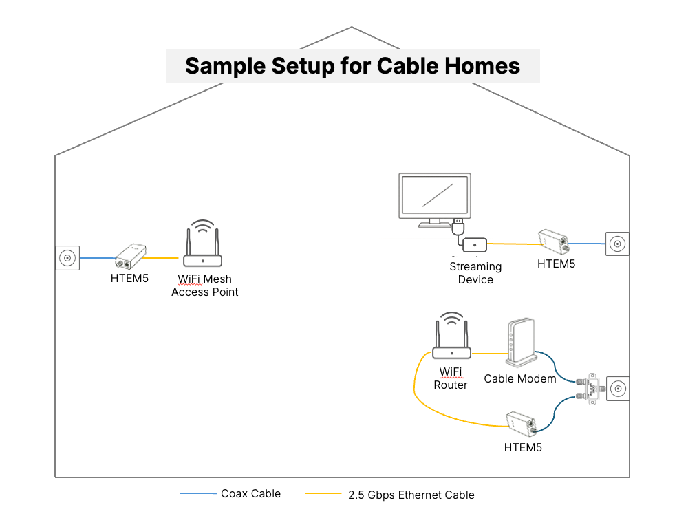 Get a MoCA 2.5 Network Adapter and Ethernet Cable. Connect the Ethernet Cable from the Access Point or Device (gaming console, streaming TV player, laptop etc.) to the MoCA 2.5 Network Adapter. Get the Coax Cable and connect the Coax Cable from the ...